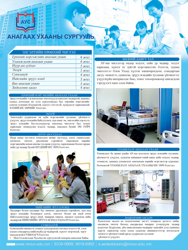 Эрхэм зорилго: Мэргэжлийн өндөр ур чадвартай, хүмүүнлэг, олон улсын түвшинд өрсөлдөхүйц хэмжээний мэргэжилтэн бэлтгэдэг, боловсрол, эрдэм шинжилгээ, эрүүл мэндийн үйлчилгээ үзүүлэгч шилдэг сургууль байна. Зорилт: Дэлхийн шилдэг сургалтын технологийг сургалтандаа ашиглах Судалгаа шинжилгээний олон улсын чиг хандлагыг тусгасан тэргүүлэх зэргийн инноваци, эрдэм шинжилгээний байгууллага болох Олон улсад хүлээн зөвшөөрөгдсөн хөтөлбөрийн дагуу сургалт явуулдаг улсын хэмжээний яаралтай тусламжийн сургалтын төв болох Ирээдүйн эмч, эмнэлгийн мэргэжилтэнд ёсзүй, харилцаа, хандлагын төлөвшил олгох ГАДААД ХАРИЛЦАА, ХАМТЫН АЖИЛЛАГАА АУС нь дэлхийн шилдэг сургалтын технологийг сургалтандаа ашиглах, судалгаа шинжилгээний олон улсын чиг хандлагыг тусгасан тэргүүлэх зэргийн эрдэм шинжилгээний байгууллага болох зорилтын хүрээнд гадны шилдэг их дээд сургууль, эрдэм шинжилгээний байгуулагуудтай хамтын ажиллагаагаа эхлүүлээд байна. Стэнфордын Их Сургууль, АНУ Чoсаны Их Сургууль, БНСУ Тайпейн Анагаах Ухааны Их Сургууль, Тайвань Daegu Haanu Их Сургууль, БНСУ СУРГАЛТЫН ҮЙЛ АЖИЛЛАГАА, МЭРГЭЖЛИЙН ЧИГЛЭЛ Сургууль байгуулагдсанаас хойш 5 жилийн хугацаанд оюутны тоо 5 дахин, багшлах боловсон хүчний тоо 8 дахин өсч, одоогоор 5 хөтөлбөрийн баг, 42 эрдэмтэн багш ажиллаж байгаагийн 10 нь эрдмийн зэрэг цолтой,  1111 оюутан суралцаж байна. Дараах мэргэжлийн  хөтөлбөрүүдийг хэрэгжүүлж байна. - Анагаах ухаан- Уламжлалт анагаах ухаан- Нүүр ам судлал- Нийгмийн эрүүл мэнд- Эм зүй- Сувилахуй- Биоанагаах- Хөдөлгөөн засал 2018 онд сувилахуйн мэргэжлээр анхны төгсөлтөө хийж 13 сувилагч бэлтгэсэн нь 100% мэргэжлийн  ажлын байранд амжилттай ажиллаж байна Оюутнуудын хэрэгцээ шаардлагыг хангасан химийн, биологи, молекул биологи, гистологийн  лаборатори, эмнэлзүй, нүүр ам судлал, уламжлалт анагаахын ур чадварын танхим, сувилахуйн ур чадварын төв зэрэг бүрэн тоноглогдсон сургалтын орчинтой.  МҮИС-ийн АУС нь орчин үеийн техник, технологоор хангагдсан  олон улсын стандартад тохирсон,  их сургуулийн ...