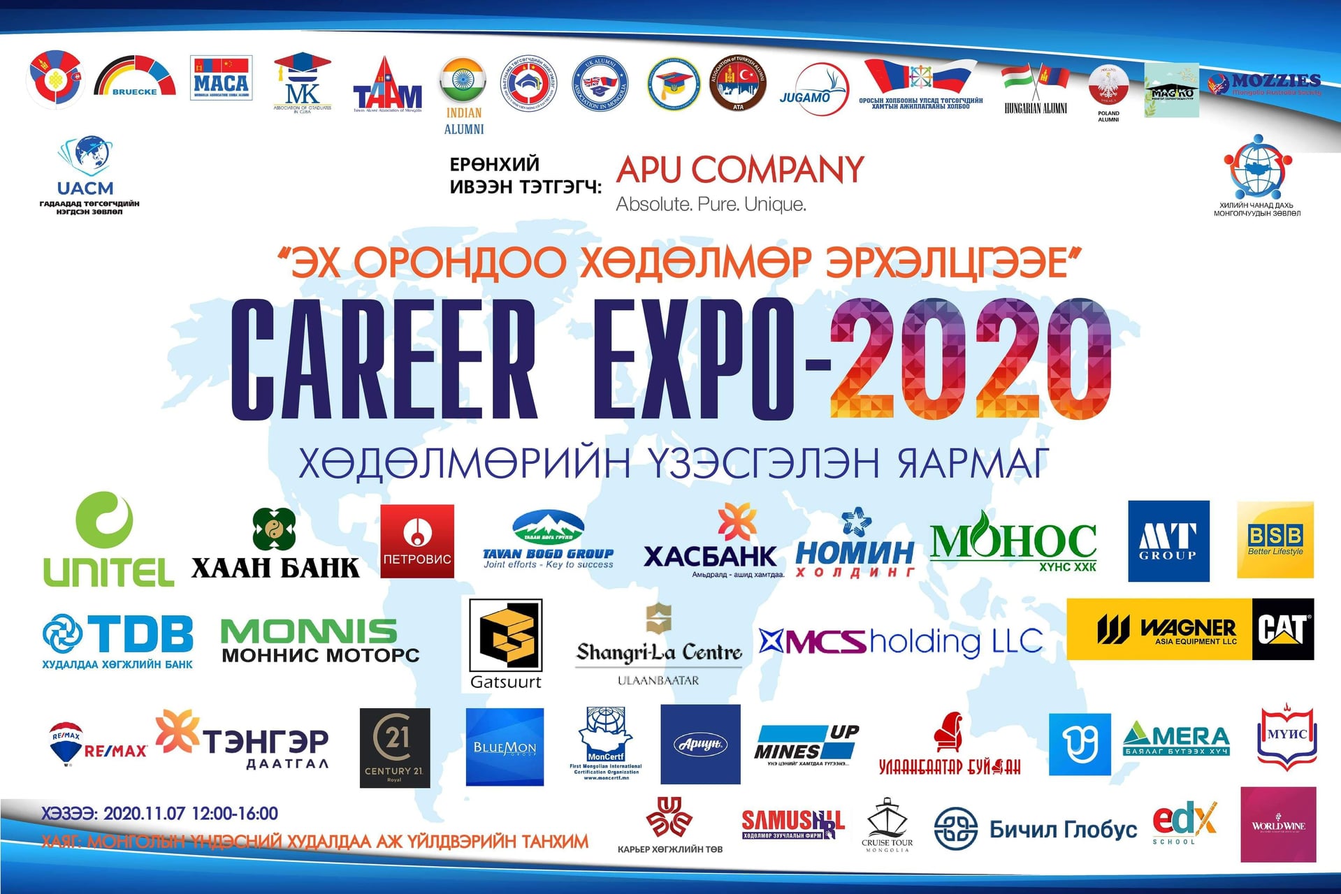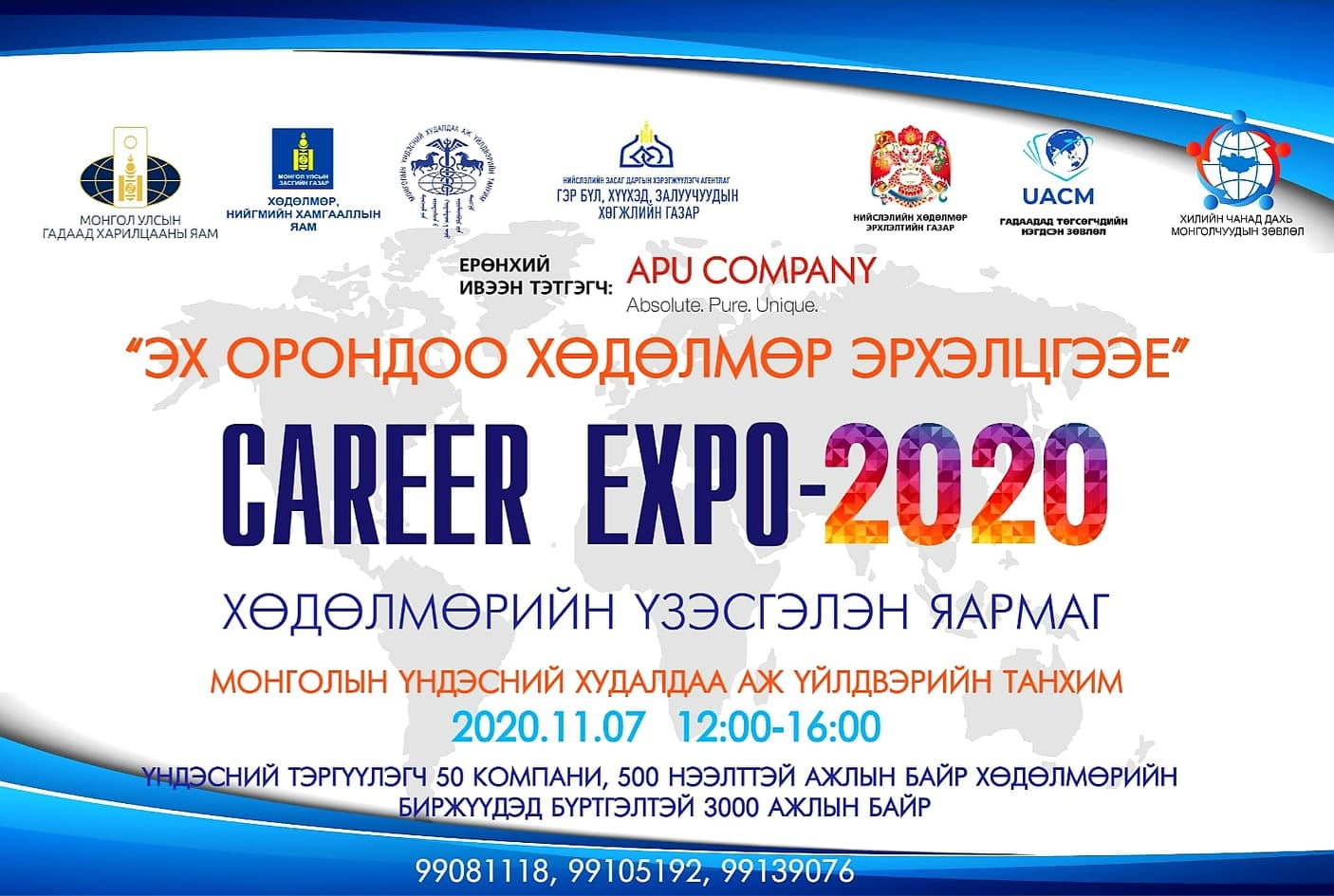 ЗАЛУУС ТА БҮХНИЙГ ХҮССЭН АЖЛЫН БАЙРАНДАА ОРОХЫГ УРЬЖ БАЙНА. “Гадаадад Төгсөгчдийн Нэгдсэн Зөвлөл”-өөс “CAREER EXPO-2020” хөдөлмөрийн яармагийг "Эх Орондоо Хөдөлмөр Эрхэлцгээе" уриан дор ГХЯ, ХНХЯ, МҮХАҮТ, НГБХЗХГ, НХЭГ, ХЧМЗ ,МҮИС байгууллагуудтай хамтран 2020 оны 11-р сарын 07-ний өдрийн Бямба гаригт 12:00-16:00 цагт Монголын Үндэсний Худалдаа Аж Үйлдвэрийн Танхимын Их тамхимд зохион байгуулж буйгаа дуулгахад таатай байна.Тус арга хэмжээ нь нийт гадаад, дотоодын их дээд сургууль төгсөгч болон залууст зориулан жилд нэг удаа хамгийн өргөн хүрээнд үндэсний томоохон компаниуд оролцон хийгддэгээрээ онцлогтой юм.